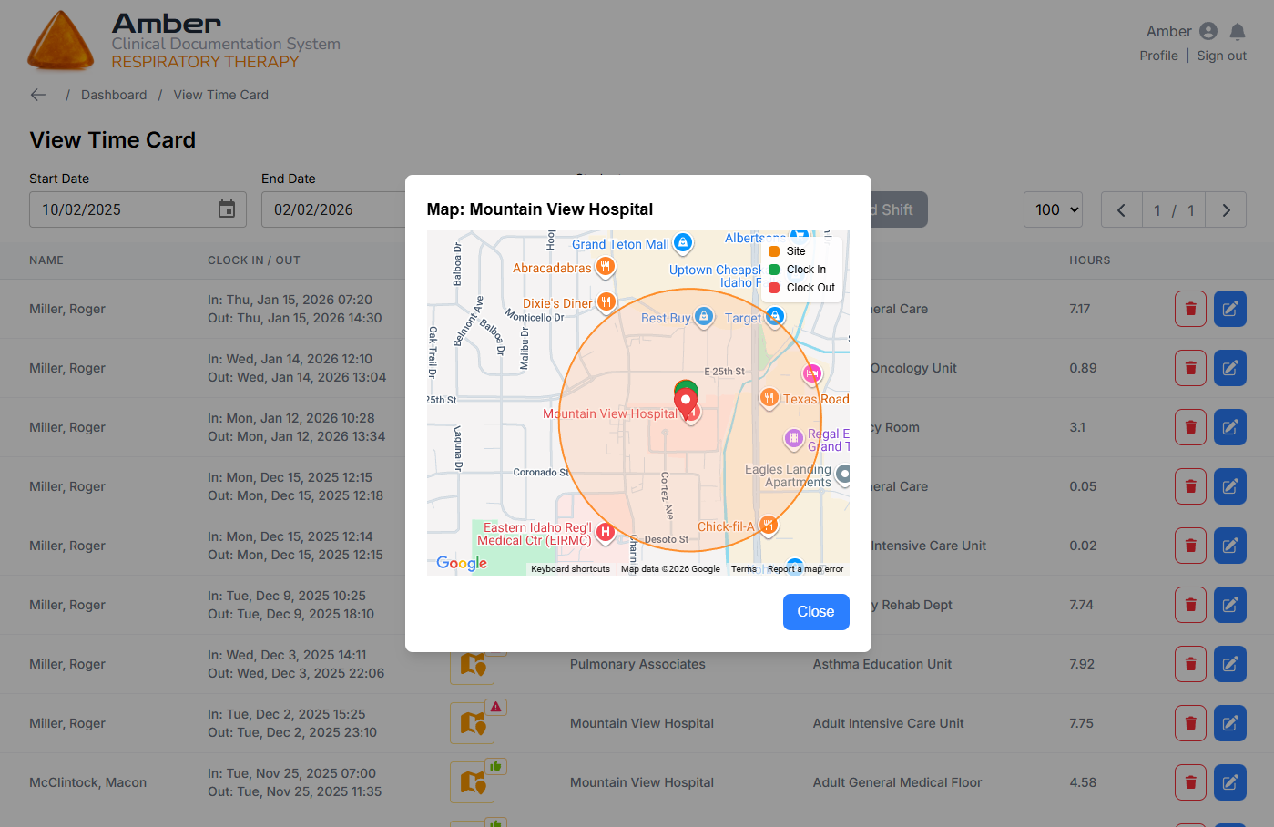 Amber's mapping system isn't just for students—it's a powerful tool for instructors too. With just a quick glance at a report, teachers can see exactly where their students are and whether they've clocked in at the correct clinical location. If someone accidentally clocks in outside the designated area, the instructor can spot it right away and help the student get back on track. It's all about giving instructors an easy way to keep everything running smoothly and making sure students are where they need to be.